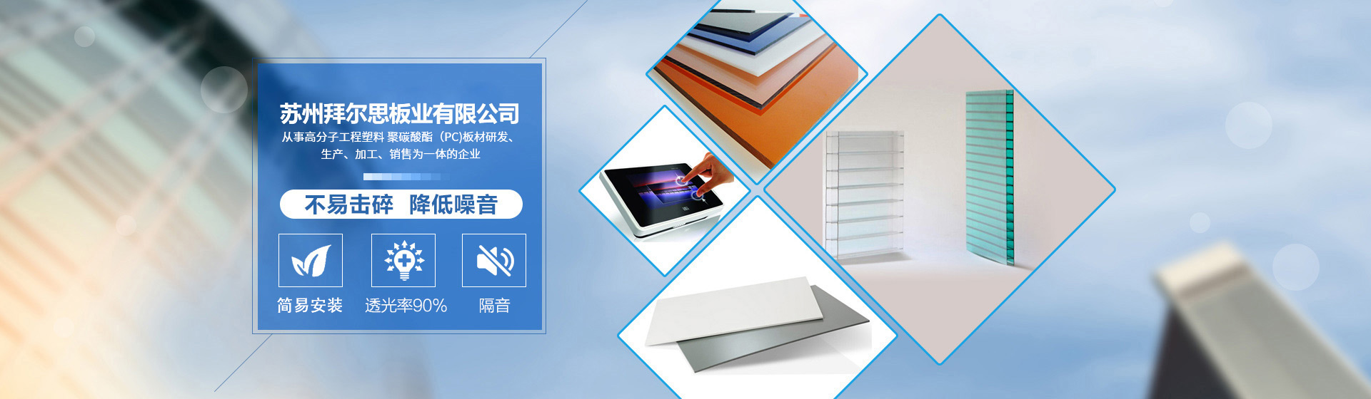 蘇州拜爾思板業有限公司是從事高分子工程塑料 聚碳酸酯(PC)板材研發、生產、加工、銷售為一體的企業。生產廠址:蘇州市相城區黃埭鎮東橋警民路8號;江蘇省大豐市大橋工業園。公司產品體系豐富,主營產品有PC耐力板、PC工業用板、PC燈箱廣告板、PC浪瓦、PC車雨棚專用板、PC陽光板等,同時近期通過公司技術人員的不懈努力再次推出PC耐酸堿板、PC隔熱板、PC防靜電板、PC硬化板、V0級阻燃板等聚碳酸酯PC系列新型產品。